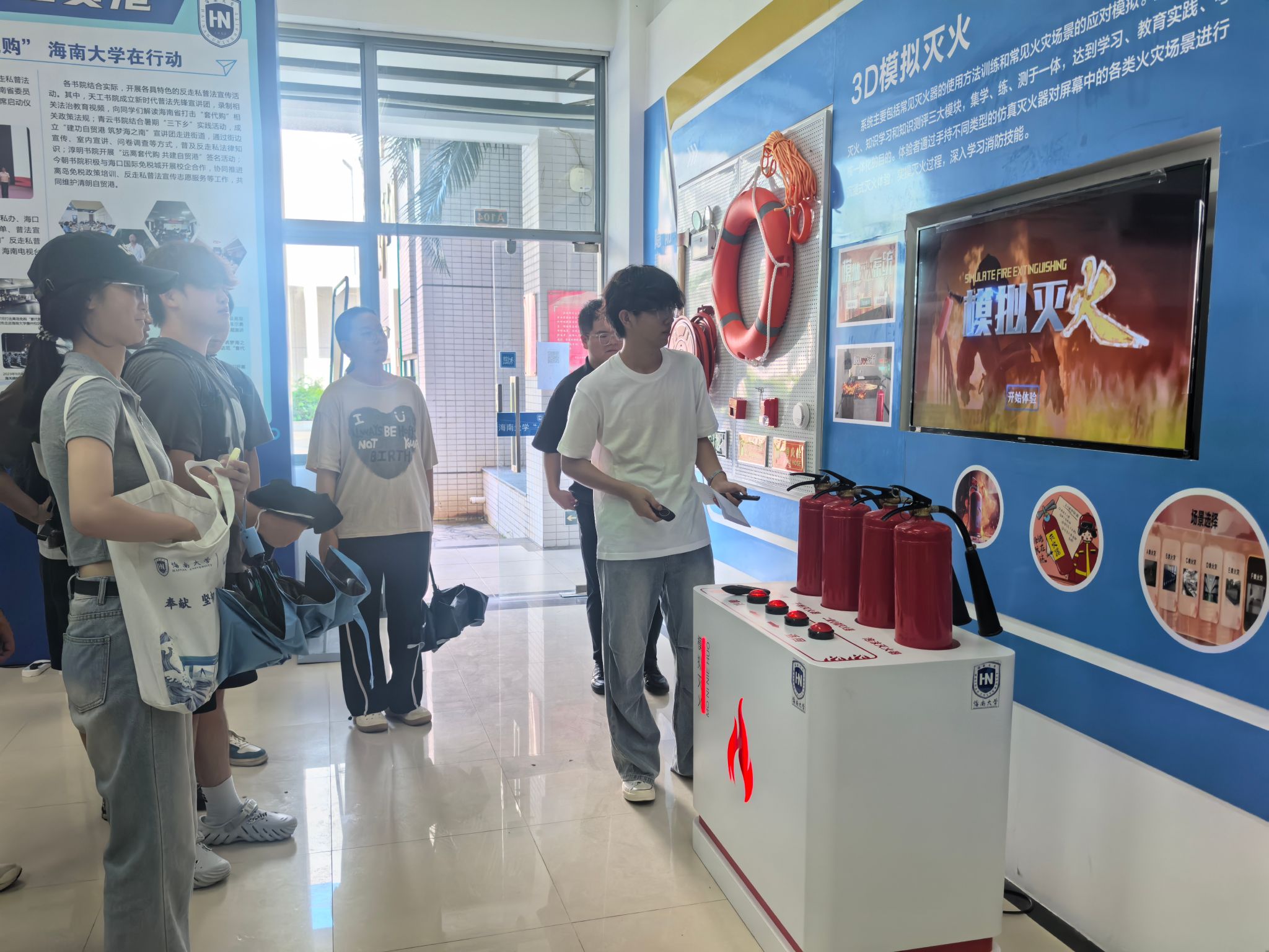 活动还设置了实景模拟环节,组织学生在3D模拟灭火系统中操作灭火,在机器设备上作答,进一步深化了学生对安全知识的理解和应急情况的处置。