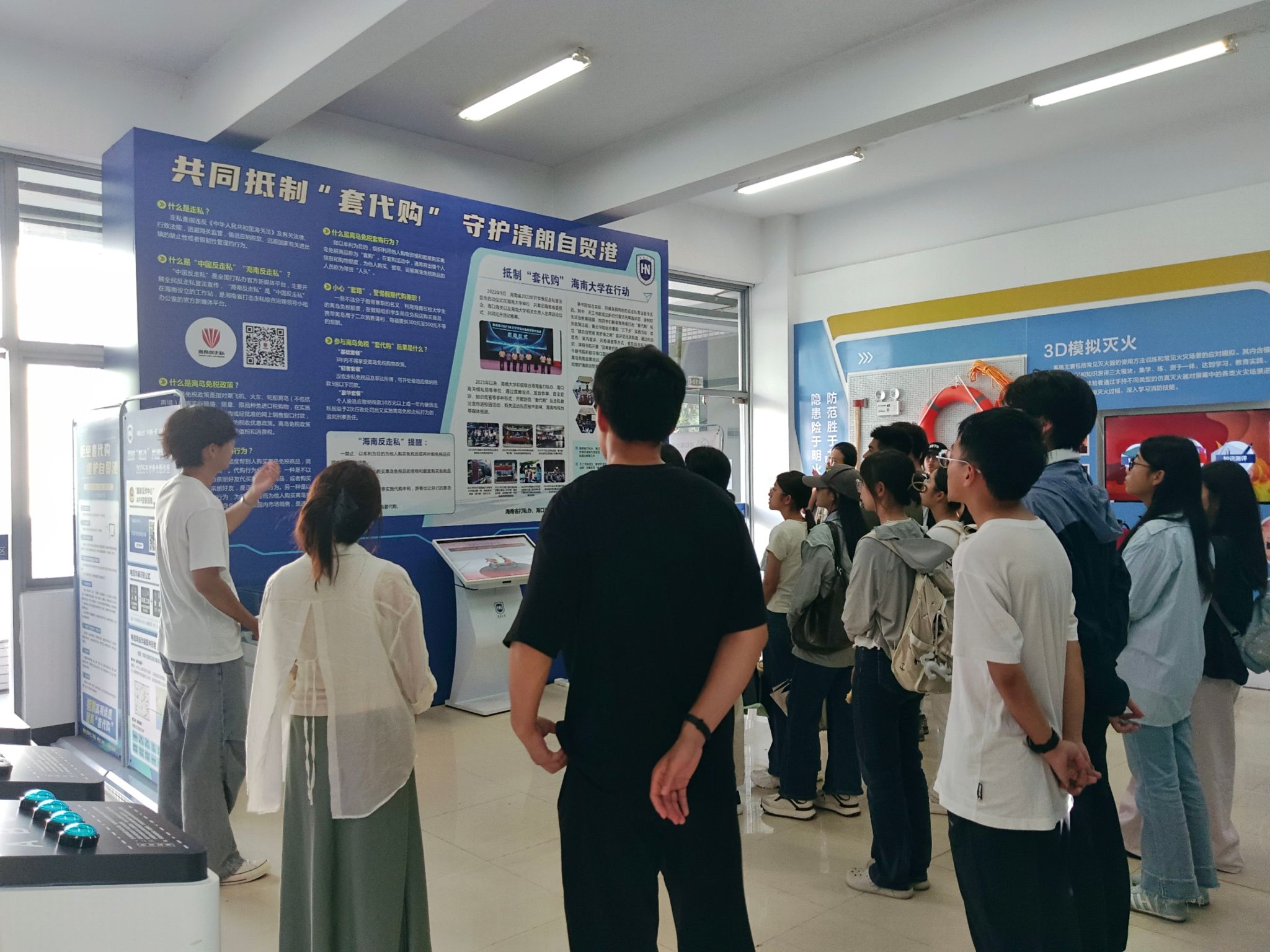 在思源学堂安全体验教育馆内,讲解员围绕国家安全、电信诈骗、急救知识、宿舍安全和消防安全等内容,进行详细讲解。紧接着,Bwin必赢学工办主任陈蕾蕾老师以通俗易懂的语言阐释了离岛免税购物政策和相关法律法规,并结合近期发生的“套代购”违法犯罪典型案例,向同学们介绍了“套代购”的性质及危害,引导同学们坚决抵制“套代购”等违法行为。